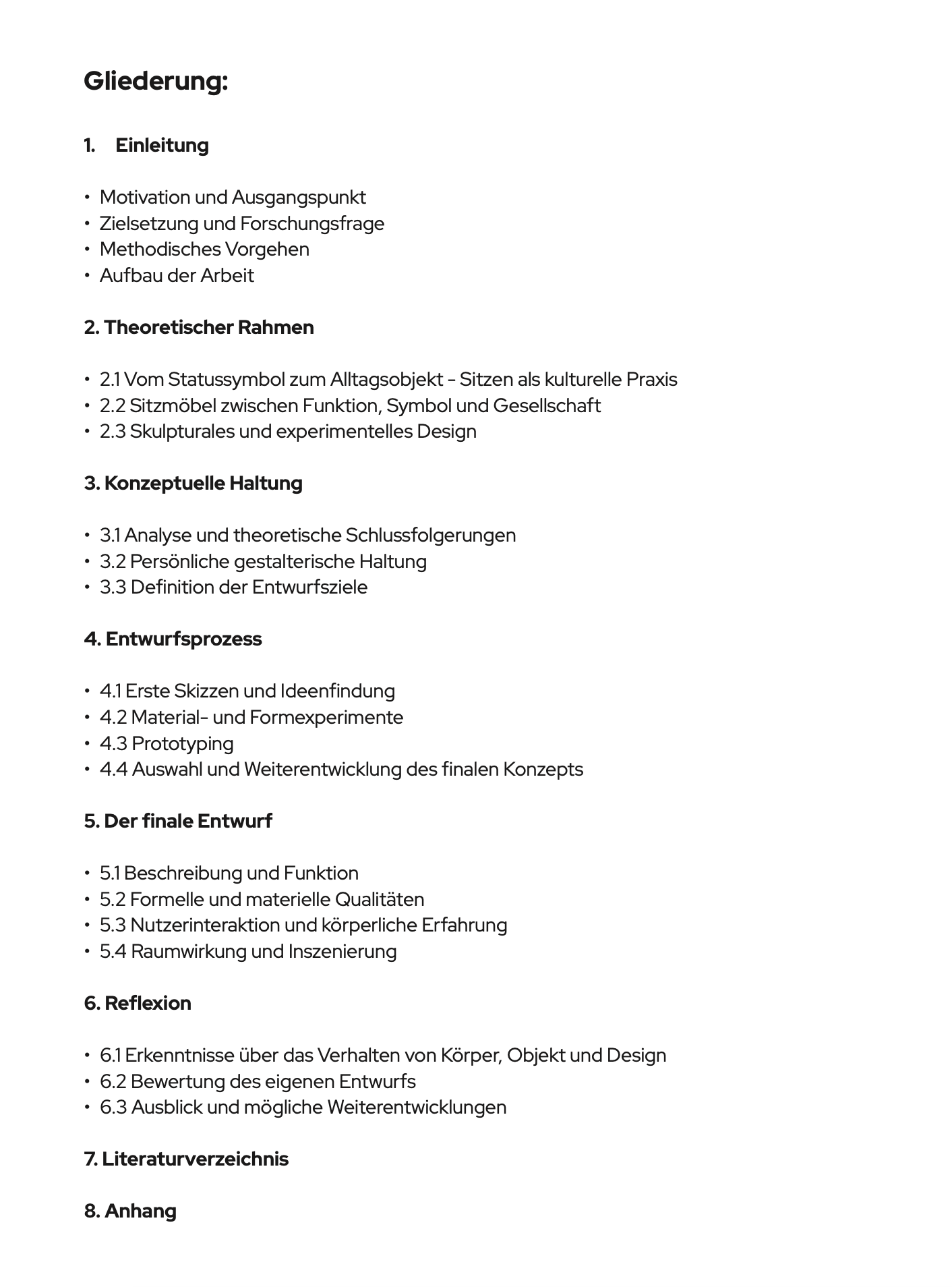 Methodisch stütze ich mich auf Recherche zu der Bedeutung des Sitzens, Designklassikern und künstlerischen, experimentellen Positionen. Im Entwurfsprozess möchte ich mithilfe von Skizzen, Prototyping und Materialexperimenten zu einer Gestaltungslösung kommen, aus welcher der Entwurf sowie ein 1:1 Modell resultiert. Mein Ziel ist ein gestalterisches Statement, das über reine Funktionalität hinausgeht. Ein Sitzmöbel, das den Dialog zwischen Körper, Objekt und Design eröffnet und zum Nachdenken über unsere Sitzkultur anregt.