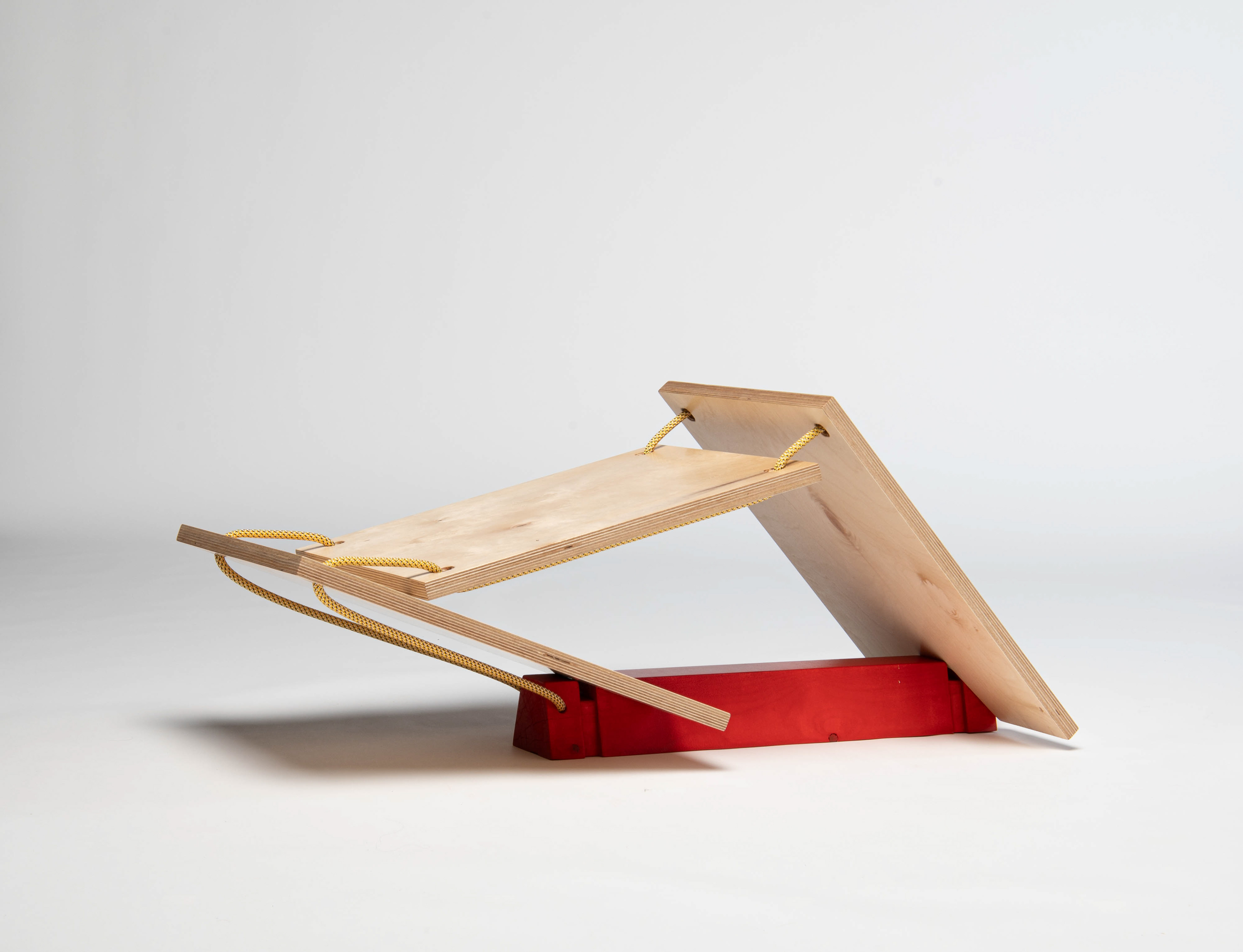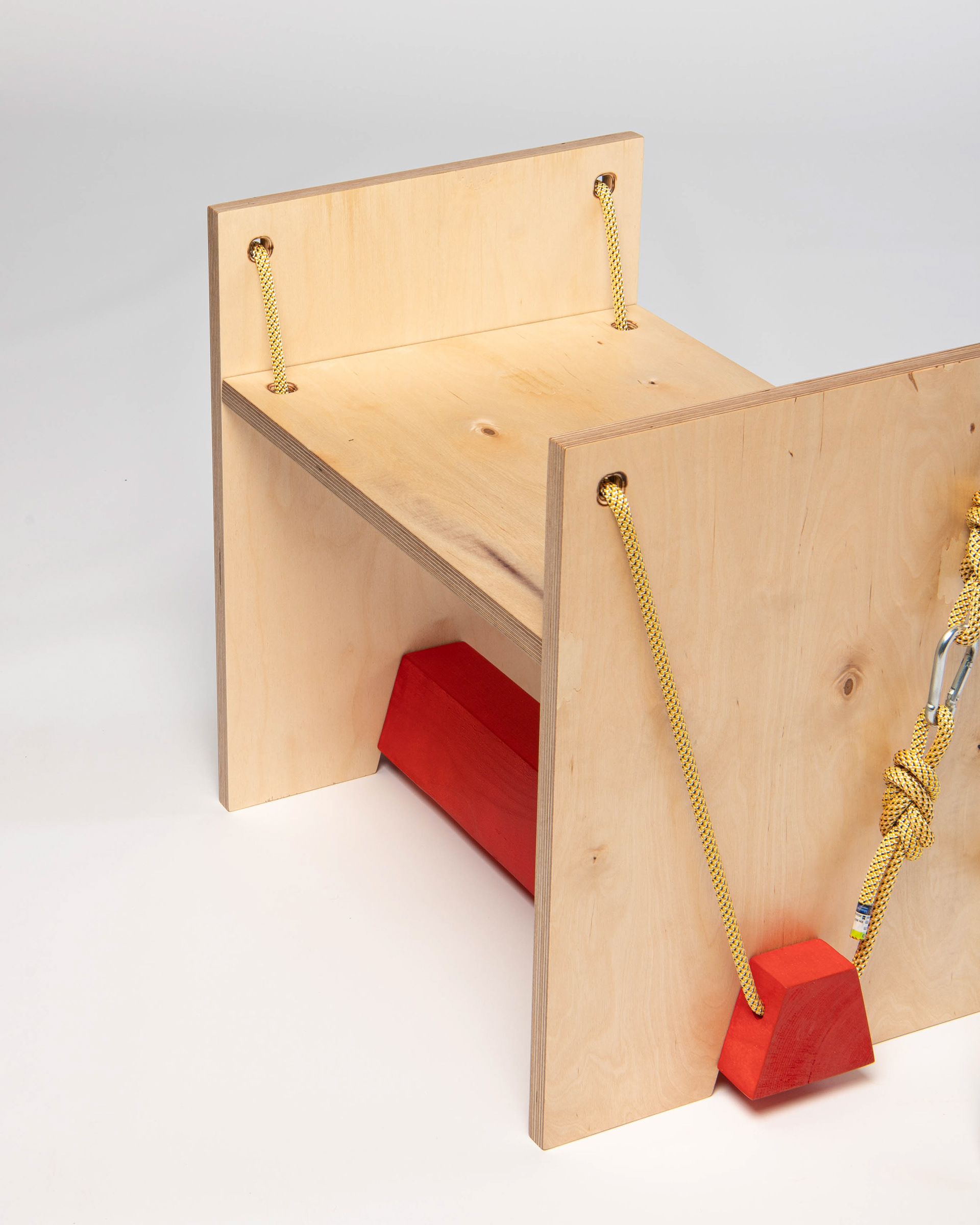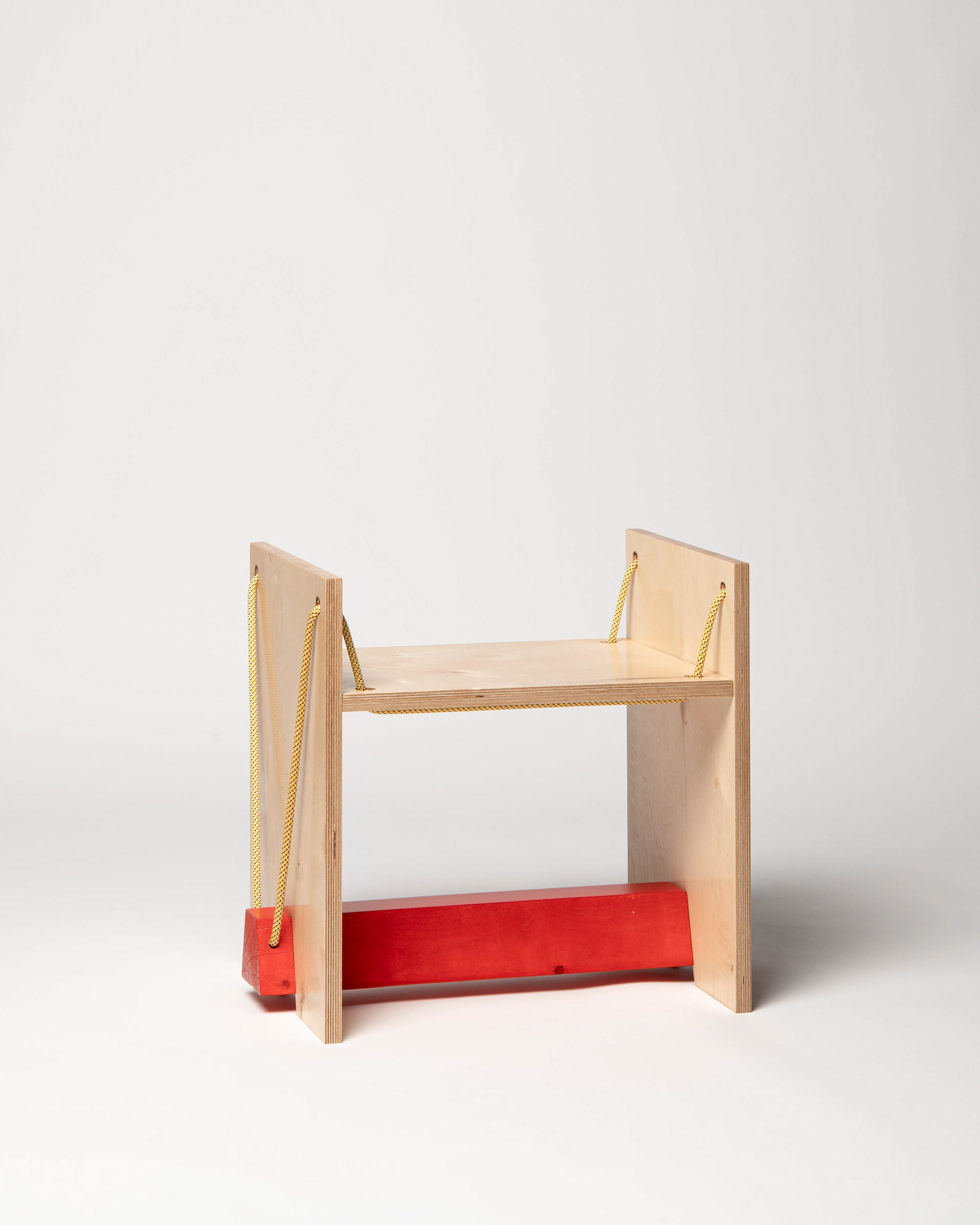 Durch das Gewicht senkt sich die Sitzfläche ab, gleichzeitig zieht das rote, verbindende Holzelement das Seil straff und sich selbst in die vorgesehenen Aussparungen. Was vorher lose wirkte, verriegelt sich. Was vorher instabil schien, wird stabil. Die Aktion des Platznehmens verwandelt das Objekt vom potenziellen Chaos in ein funktionierendes System.