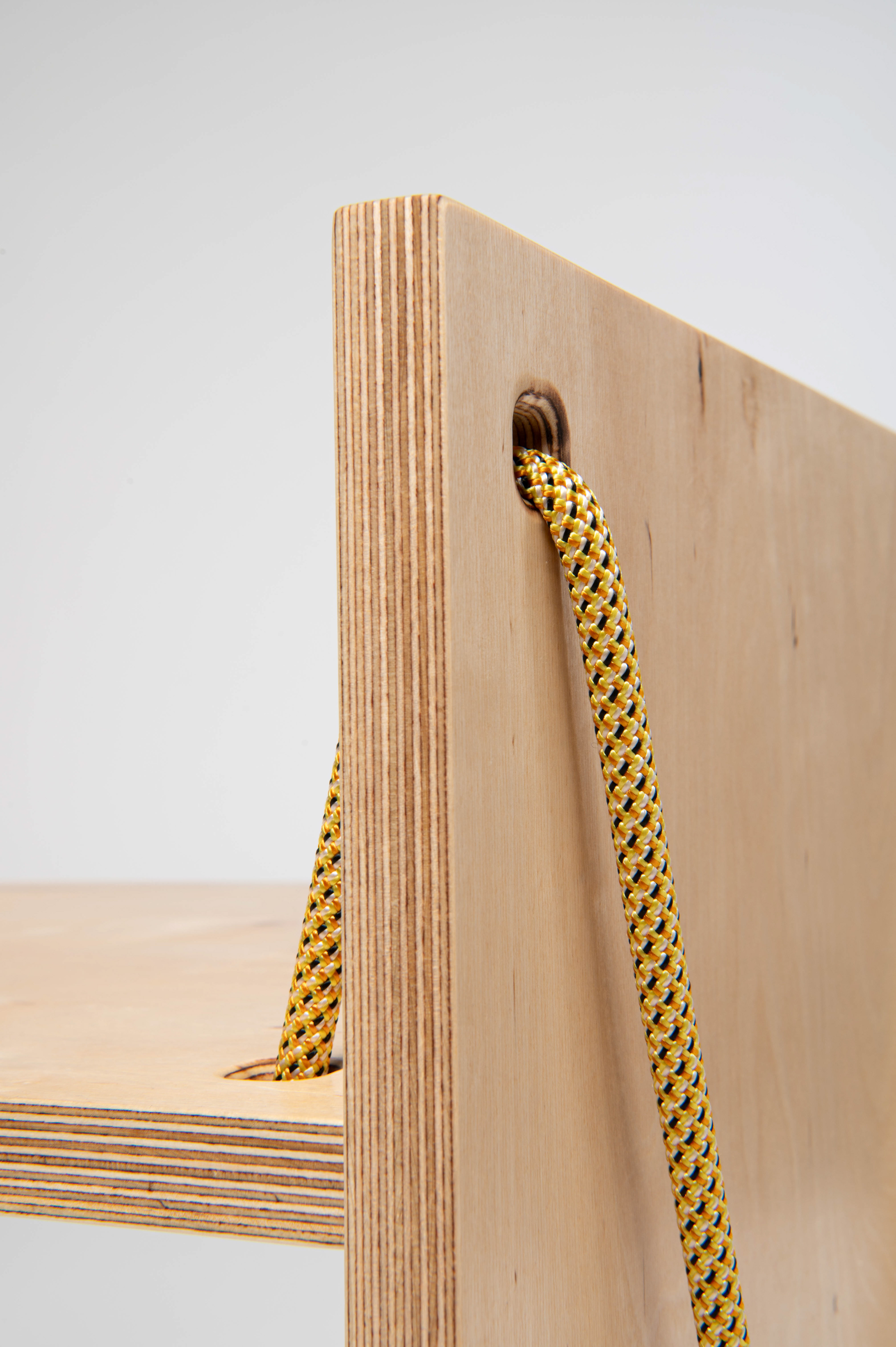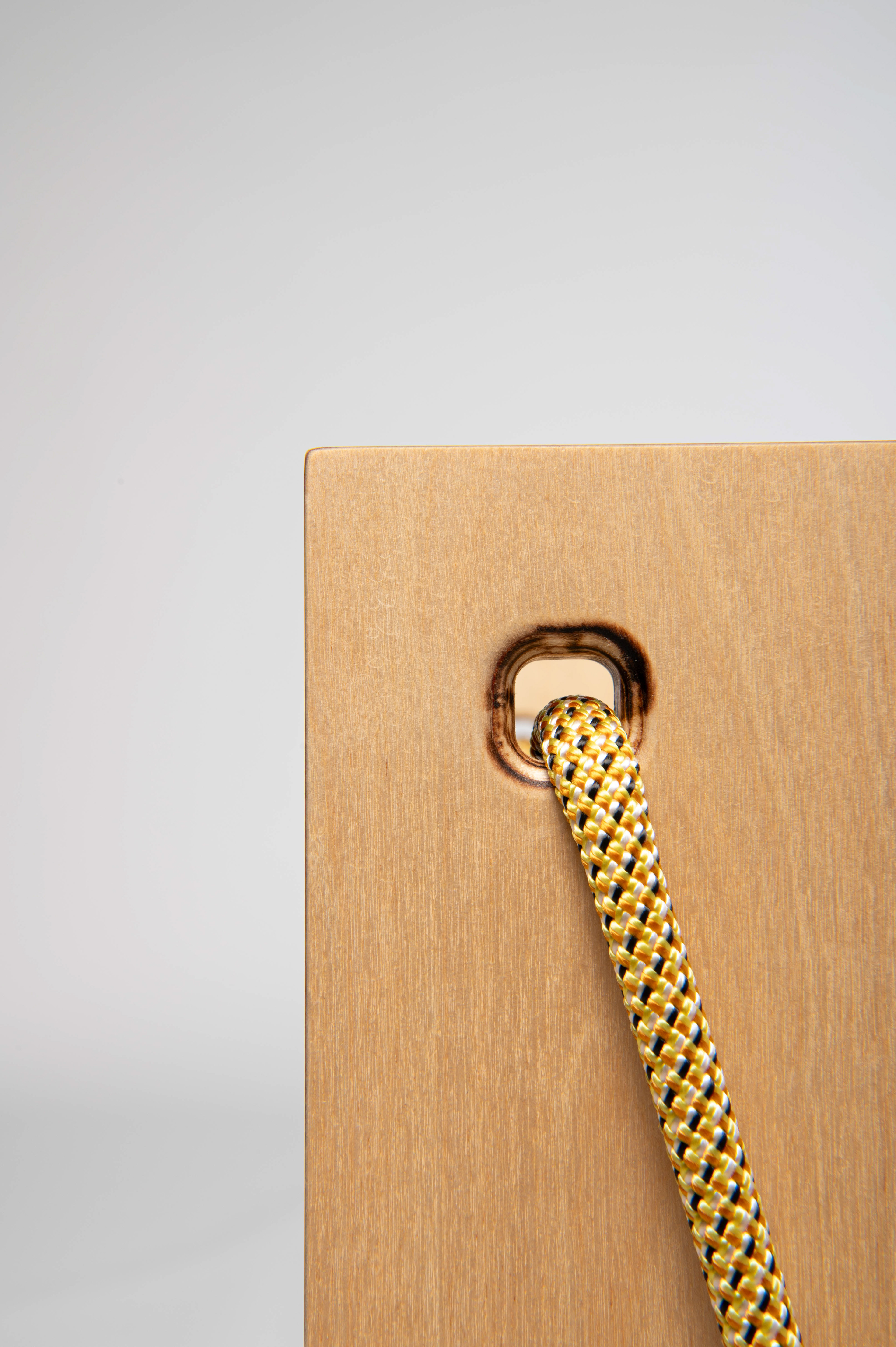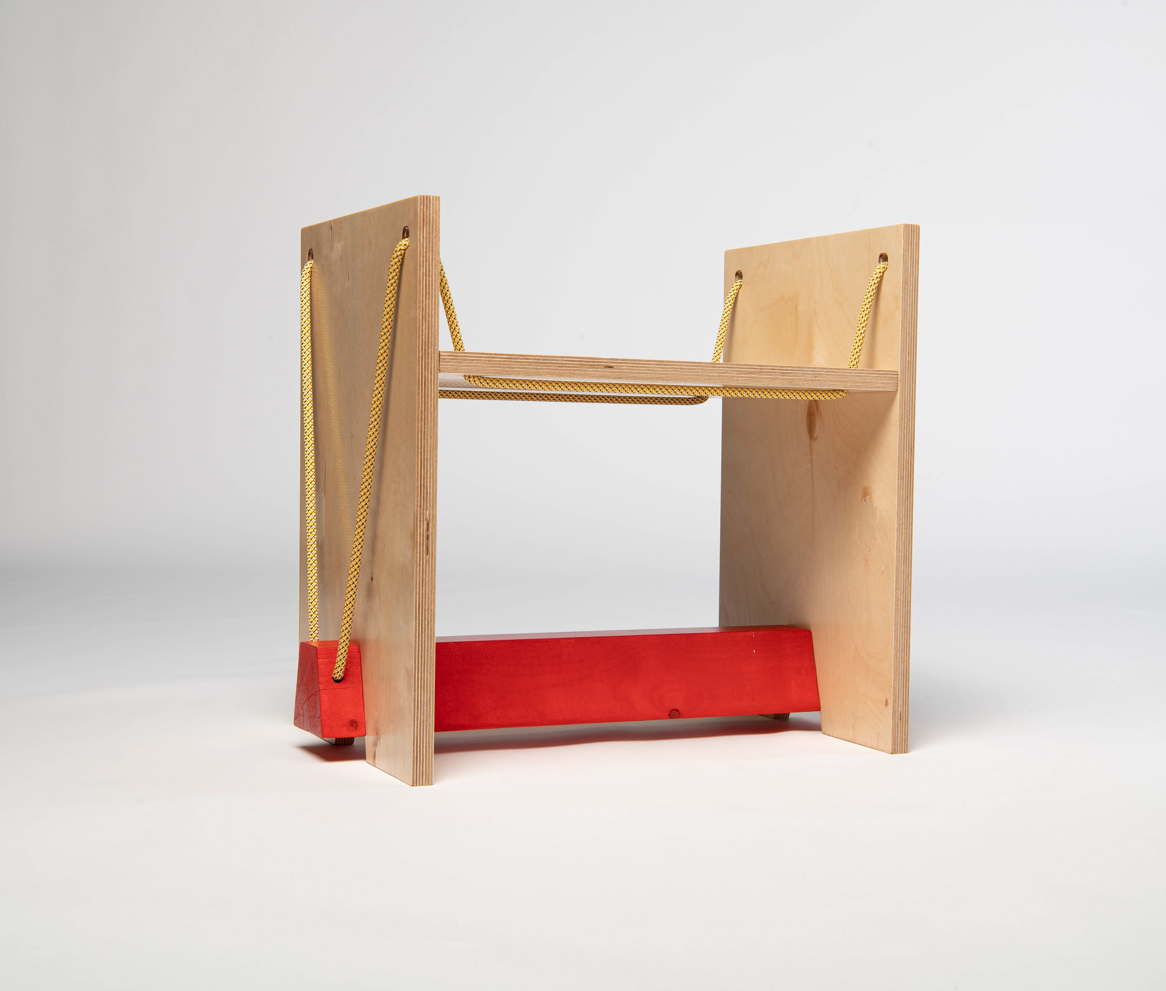 Durch das Gewicht senkt sich die Sitzfläche ab, gleichzeitig zieht das rote, verbindende Holzelement das Seil straff und sich selbst in die vorgesehenen Aussparungen. Was vorher lose wirkte, verriegelt sich. Was vorher instabil schien, wird stabil. Die Aktion des Platznehmens verwandelt das Objekt vom potenziellen Chaos in ein funktionierendes System.